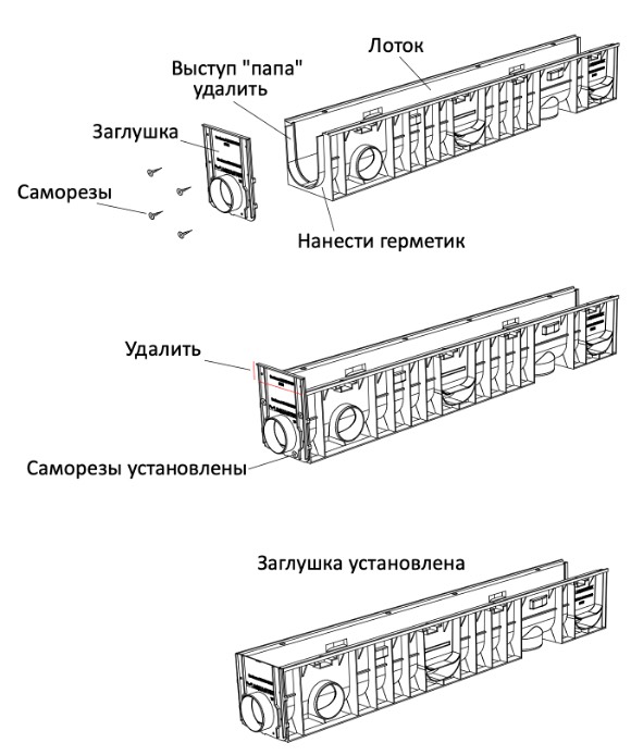 Заглушка обеспечивает герметичность линии водоотведения с торцов лотка, предотвращает утечку воды и подмыв основания.