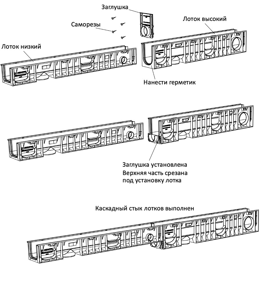 Используются лотки с одинаковым DN, но разной высоты, которые устанавливаются от меньшей высоты к большей в направлении сброса воды. Между уровнями применяются заглушки, обеспечивающие герметичность.