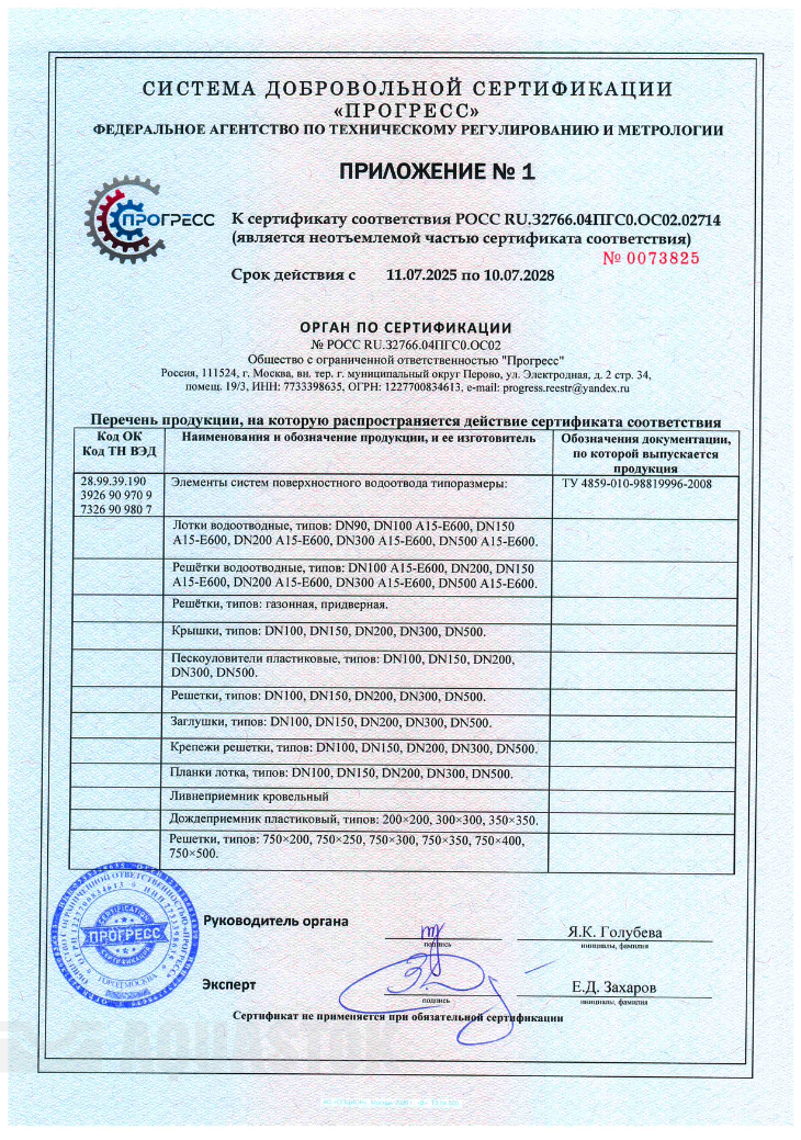 Наша продукция не является продуктом обязательной сертификации. Тем не менее качество продукции «Аквасток» подтверждено добровольными сертификатами соответствия заявленным требованиям, в том числе сертификатом РЖД (ФБУ РС «ФЖТ»). Мы проверили свою продукцию, чтобы вы были уверены: наш водоотвод прослужит вам долго.